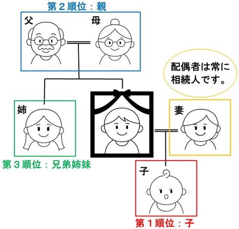 仮に夫が亡くなった場合は、配偶者である妻は必ず相続人になり、その他以下のような順位で相続の権利が発生するよ。